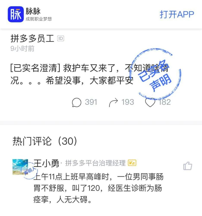 当我放上去之后,这条消息很短的时间内就上了热搜。公司说明这位同事只是因为肠痉挛被救治人还健在,同时我需要表达的是这条消息在公司内部是完全没有披露的,我们要在脉脉上看到公司的实名说明,这是不幸中的万幸。