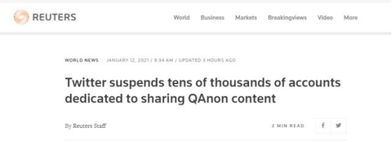 FX168财经报社(香港)讯 在推特此前宣布永远移除特朗普账号之后,路透社最新消息,当地时间1月11日晚,美国社交媒体推特公司表示,自当地时间1月8日以来,已经暂停了7万多个主要用于分享所谓“匿名者Q”内容的账户。