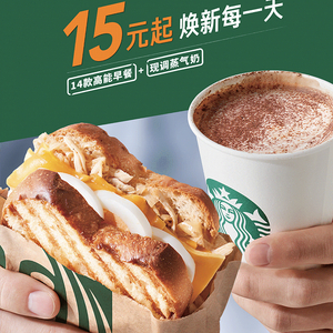 据星巴克中国发布的消息,早前在上海和台州两地试点推出的15元起早餐,未来将覆盖江浙沪和深圳所有门店。这款早餐套餐在每日10点半前供应,餐品包括一杯蒸汽奶饮品加一份早餐食品,食品可选项有14款,比如培根芝士蛋堡、肉松佛卡恰、鸡肉芝士三明治等等,售价为15元或19元。如果需要,消费者还可以加钱将蒸汽奶升级为咖啡饮品。