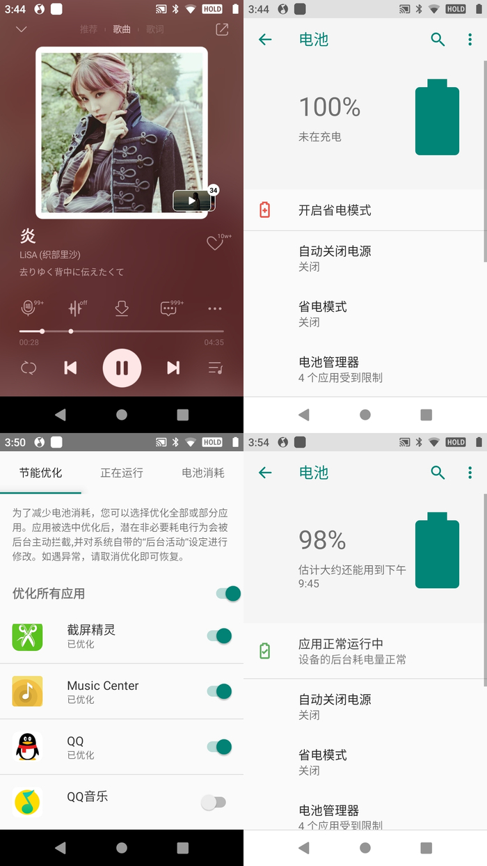 当然,理论说辞并不能代表实际表现。以QQ音乐为例,在关闭节能优化功能的情况下,从下午3点44分到3点55分,持续播放10分钟的音乐,结果设备电量从100%降至98%,耗电2%。