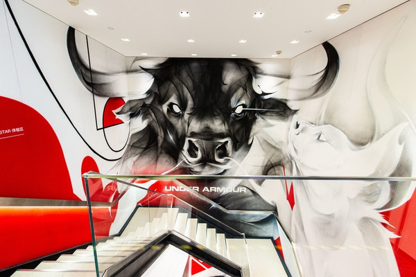 UA杭州in77旗舰店的设计风格也独具特色。店铺兼容了骑楼、青砖等江南元素,还特邀国内艺术家以“牛”为元素,创作了“斗”、“奔”、“胜”等运动个性涂鸦。不仅完美演绎了安德玛“有我就没完”的专业“牛气”,还能展现运动家们恢弘磅礴的运动 “牛人”之姿,也和即将到来的农历辛丑牛年相得益彰。