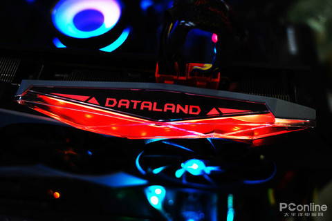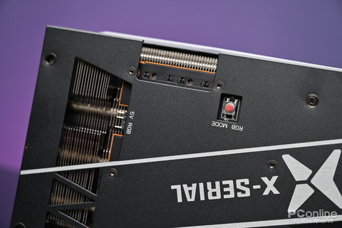 背板上延续了X战神系列历代都有灯效调节按钮,按下即可改变灯光颜色,但在上机后,按钮位置略显尴尬。此外,迪兰RX6800 XT X战神尾部还有一个5V RGB接口,但比较遗憾的是没包装中并没有附赠同步线,需要自行额外购买。此外,在接口旁我们可以看到镂空式设计,优化风道同时增大鳍片与空气接触面积,进而提升散热效率。