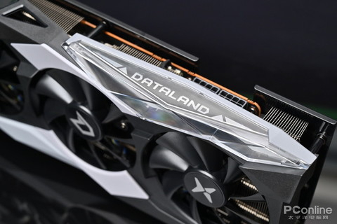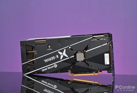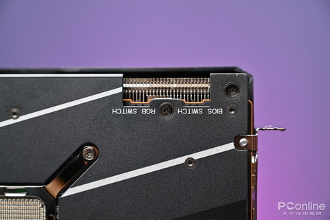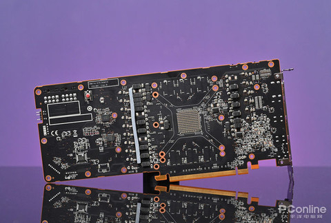 视角来到显卡背部,大面积金属背板将PCB完全覆盖,显卡核心处设计了专门的保护扣具。背板尾部采用镂空设计,加大散热面积,提升散热效率。