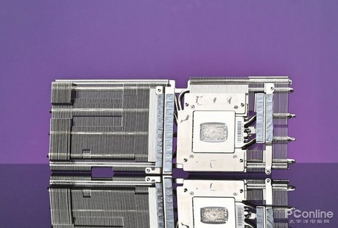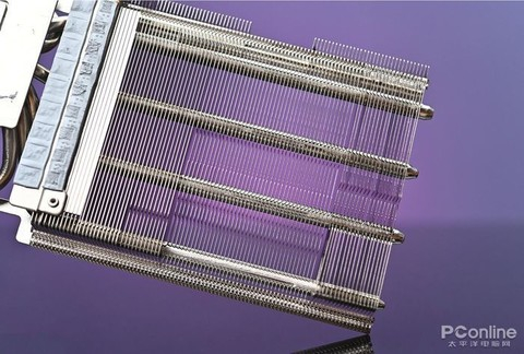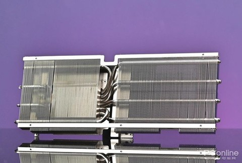 再来看到巨大的散热模块,导热部分做工一如既往的优异,散热鳍片间间隙分明有序,6根大热管贯穿,加上多段式散热鳍片配合回流焊工艺,穿fin工艺等设计,带来更高效的散热能力。