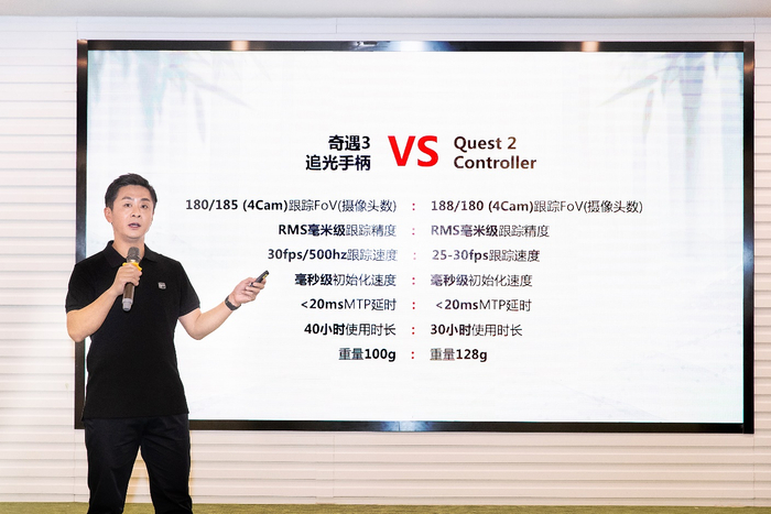 第三,技术研发能力。VR这个领域,由于缺少行业标准,因此需要大量的自主研发和适配能力,比如在底层安卓的基础上,几乎所有接口都需要重新适配,更不用说在手机、平板的平面交互转向空间交互过程中,所需要做的大量开发工作。从奇遇VR这次CV 6DoF技术跟进的速度和参数表现来看,其技术研发储备还是非常不错的(奇遇推出的CV 6DoF技术实现了毫米级定位精度、毫秒级初始化、以及毫秒级延迟,与Quest2 Controller参数不相上下)。