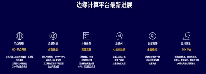 另外,2020年,百度智能云边缘平台也有不少新进展,已经做到了节点规模全面覆盖、边缘网络全面升级、计算形态高度完备、边缘安全、边缘 AI 丰富灵活、运维报警全面感知、应用场景丰富多样八大新突破。