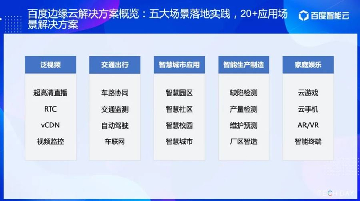 2020年,百度智能云边缘计算解决方案全面覆盖城市应用、交通出行、智能生产制造、广电视频、家庭娱乐五大场景。