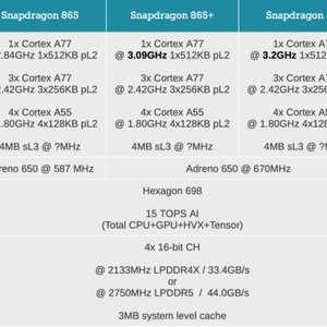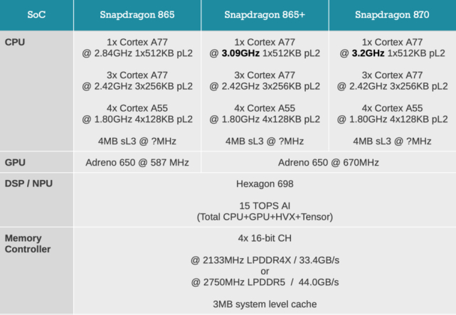 高通骁龙870的CPU部分采用1+3+4结构,拥有4MB L3缓存。包含一个Cortex-A77大核,主频最高可达3.2GHz;三个Cortex-A77核心,主频2.42GHz;四个Cortex-A55小核,主频1.8GHz。GPU部分为Adreno 650,主频670MHz。