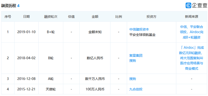 公司目前共经历了4轮融资,最早的一次是2015年12月,获九合创投100万元投资,在2016年12月,获搜狗数千万A轮投资,在2018年4月份,获复星集团、搜狗数亿元B轮投资,在2019年1月,获中信建投资本、平安全球领航基金B+轮投资。