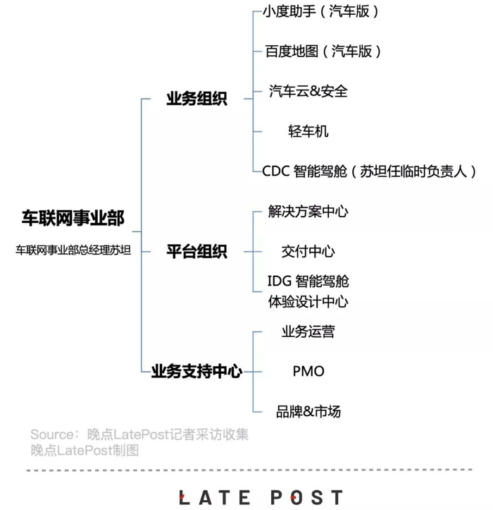 据《晚点 LatePost》了解,IDG 组织架构在 1 月 19 日有了最新变化:百度 IDG 下设的百度车联网事业部进行组织调整,同时设立 5 个业务组织、3 个平台组织以及 3 个业务支持中心,均向车联网事业部总经理苏坦汇报。业务组织包括小度助手(汽车版)、百度地图(汽车版)、汽车云 & 安全、轻车机(手机投屏互联方案)和 CDC(智能驾舱)。