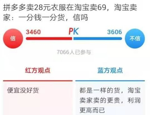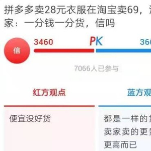 最近就刷到一条有意思的投票,拼多多卖28元的衣服,在淘宝上却要69元。淘宝卖家给出的理由看起来也有点道理:一分钱一分货。