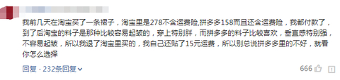 甚至还有卖得贵,材质反而差一些的。这位网友就透露,她分别在淘宝和拼多多买了一条裙子,淘宝比拼多多贵120块不说,用的材料还容易起皱。在拼多多买的那条比较符合自己的心意,垂直感很强。她认为不应该对平台有偏见,主要是看个人选择。