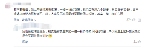 想想也是,没几个人知道一件商品的出厂价,还不是听卖家的一面之词。之前做过网店客服的网友就现身说法,表示一模一样的衣服,他们店会挂几个链接,有的卖39元,有的卖69元,有消费者问的话,就说材质不一样。