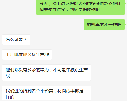 对此,专门咨询了做电商的朋友,他在几个平台都有开店卖衣服。从他口中得知,基本上工厂是没有多余的精力,也不可能单独再设生产线的,他们在各个电商平台卖的所有商品,成本和材料都是一样的。