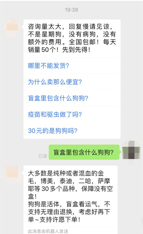 然而21日晚,从被曝光的一家店铺可以发现,虽然相关商品已经下架,但仍可以通过联系店家获取链接,自动回复中还有“狗狗是活体,盲盒看运气,不支持无理由退换,考虑好再下单”的提醒。