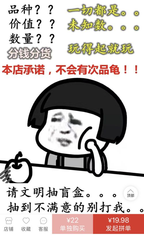 而在商品详情页面,店家更是写道:“品种?价值?数量?(一)分钱(一)分货,一切都是未知数……玩得起就玩”。