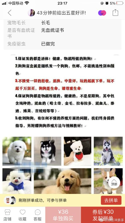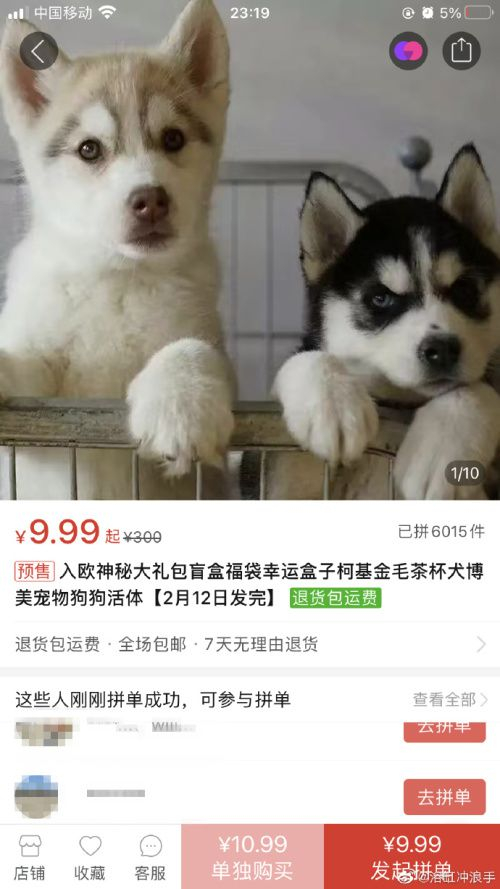 在@浴缸冲浪手 晒出的一家售卖“活体盲盒”的店铺中,商品关键词是“入欧神秘大礼包”“盲盒福袋幸运盒子”“狗狗活体”,售价在36元,参与拼单后价格为30元,销量已达5038件。