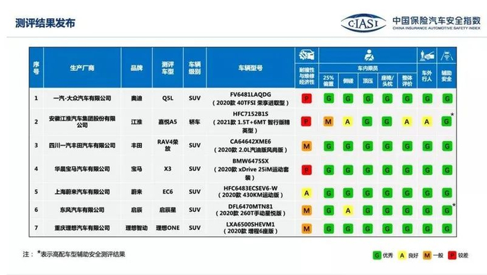 事件回顾:1月21日,中保研C-IASI公布最新一批车型碰撞测试成绩,涉及车型包括一汽-大众奥迪Q5L、江淮嘉悦A5、一汽丰田RAV4 荣放、华晨宝马X3、蔚来EC6、东风启辰启辰星和理想ONE。整体来看,绝大部分车型成绩不俗,仅有江淮汽车的嘉悦A略逊一筹。