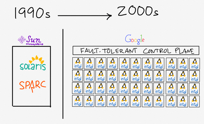 英特尔成为颠覆者的时间还不久。服务器这一块一开始是被Sun之类的集成公司统治的,在价格合适的情况,PC销量的爆炸式增长意味着英特尔哪怕是在降价的情况下也可以迅速提高性能。当然,个人电脑在可靠性方面没法跟一体化的服务器相比,但是在本世纪初的时候,Google意识到提供服务所需要的规模和复杂性意味着想做出真正可靠的技术栈是不可能的。这个问题的解决方案是在假设会出故障的情况下去构建,从而可以用价格(相对)便宜的x86处理器建设自己的数据中心。