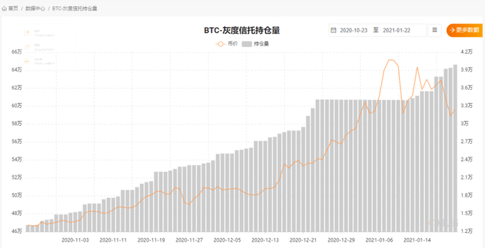 2020年11月份开始,灰度开始持续购买比特币,一度导致比特币价格大幅度上涨,不到三个月的时间,灰度比特币信托的持仓量从48万枚,增加到将近65万枚,目前灰度信托的比特币持仓总量已经超过了比特币总数的3%。1月21日,灰度信托当天增持9900每比特币,帮助比特币挽回了一波颓势。
