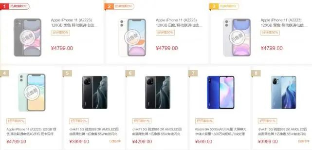 上图是截至2021年21点11分京东实时单品销量榜,从榜单上我们可以看出单品销量前八的机型之中排名前四的都是iPhone 11这款机型,只是颜色和版本不同而已。并且全部是卖光的节奏,这说明目前iPhone 11在国内市场是一机难求的状态。其实自iPhone 11诞生从来就没有让京东单品销量周冠军之座旁落过……