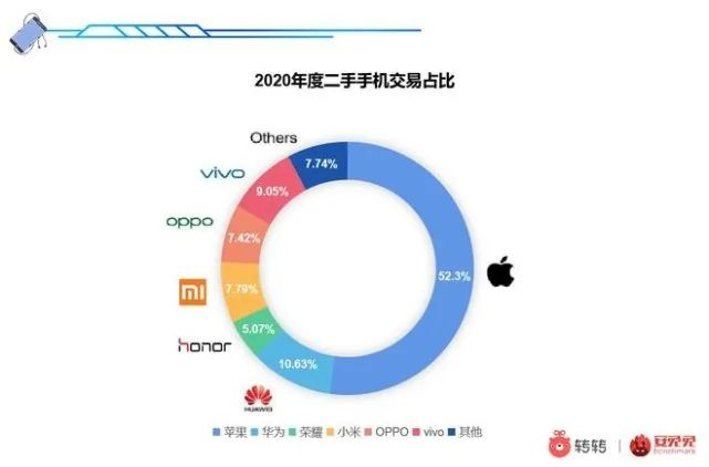 来自于转转+安兔兔的大数据显示2020年度二手机市场苹果的iPhone交易量是排名第一的,市场份额达到恐怖的52.3%,换言之占据一半以上的市场。华为排名第二,市场份额为10.63;vivo排名第三,市场份额为9.05%;小米排名第四,市场份额为7.79%。剩下的品牌大家自己看就可以 。