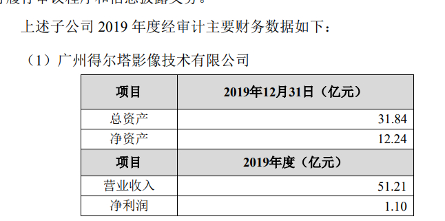 截至2019年末,上述四家子公司中,广州得尔塔总资产31.84亿元、净资产12.24亿元,2019年营收51.21亿元、净利润1.1亿元;