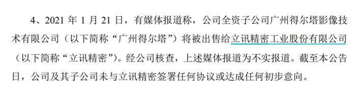 25日晚间,苹果链白马股欧菲光披露股价异动公告称,有媒体报道称,公司全资子公司广州得尔塔影像技术有限公司将被出售给立讯精密。经公司核查,上述媒体报道为不实报道。截至本公告日,公司及其子公司未与立讯精密签署任何协议或达成任何初步意向。