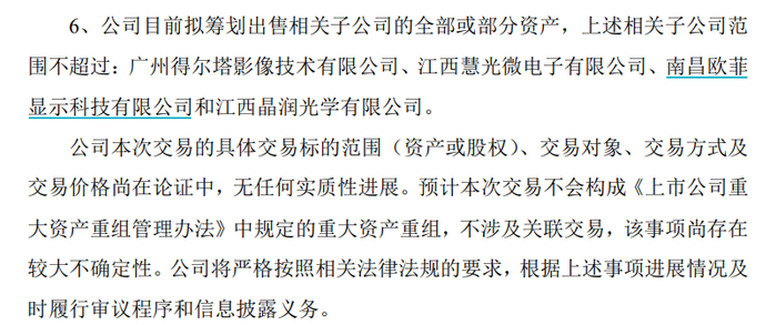 另外,关键信息来了,公司还同时公告,目前拟筹划出售相关子公司的全部或部分资产,上述相关子公司范围不超过:广州得尔塔影像技术有限公司、江西慧光微电子有限公司、南昌欧菲显示科技有限公司和江西晶润光学有限公司。