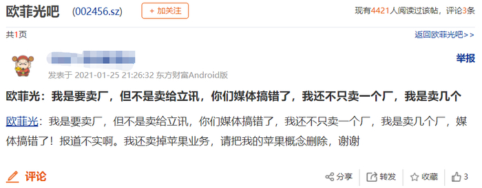 什么意思呢?股吧的网友已经给出重点。欧菲光:我是要卖厂,但不是卖给立讯,你们媒体搞错了,我还不只卖一个厂,我是卖几个厂,你们搞错了!报道不实啊。我还卖掉苹果业务,请把我的苹果概念删除,谢谢
