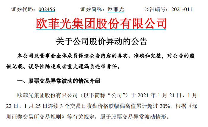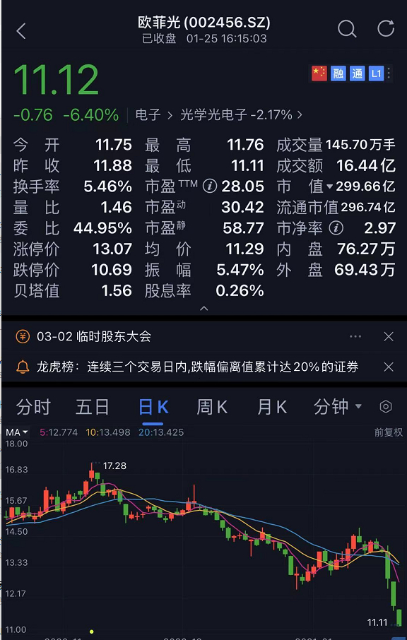 1月25日,欧菲光股价再度下跌,截至收盘,跌6.40%,报11.12元,成交额16.44亿元,三日内累跌逾20%。