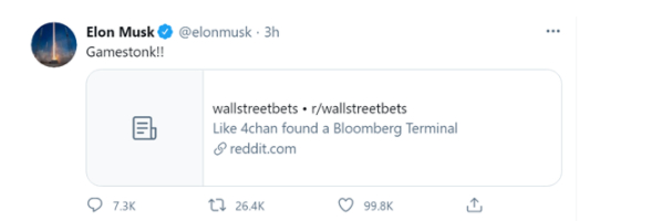 值得一提的是,特斯拉CEO马斯克在社交媒体上发帖对GameStop的走势表示赞叹。长时间以来,特斯拉稳坐美股做空市值榜第一位,做空盘比例一度占到流通盘20%以上的水平,这一比例是道指成分股平均水平的10倍。马斯克本人一直对做空者不屑一顾,他坚称空头有意压低股价,切断公司进入资本市场的渠道,以此来伤害公司,为此2018年马斯克甚至提出了私有化的想法。根据S3 Partners的数据,去年空头在特斯拉上的损失超过400亿美元。