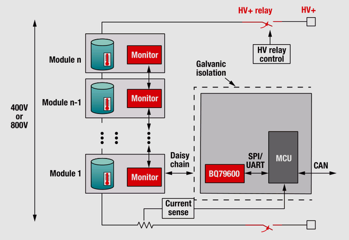 为了使电池组保持在安全工作范围,可以使用电池监测ASIC(专用集成电路)来测量电压、温度和电流,并将数据传输到电池控制单元。电池单元电压和温度传感器连接到电池监测ASIC;控制处理器通过读取测量信息来计算电池的当前状态,确保操作在安全范围内进行。对于高压电池组,监控ASIC以堆叠配置排列,每个ASIC并行测量多个单元。命令和数据通过一个隔离通信接口从ASIC传输到ASIC。