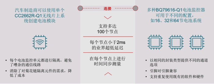 考虑到主机厂的长期设计需求,无线BMS创新技术还提供更高的可扩展性。专有协议可提供市场上最高的吞吐量,使主机厂能够在不同电池配置中(如32、48和60个电池单元的系统等)将采用单个无线片上系统的电池模块与多个BQ79616-Q1电池监视器相连。这样的系统设计支持多达100个节点,每个节点都达到业界最低延迟(低于2ms),且每个节点的测量均可实现时间同步。