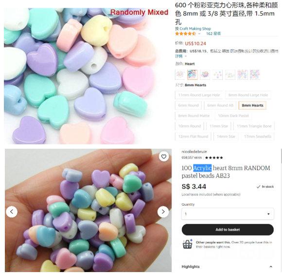不过在非手工商品上却是完全不一样的情况。Etsy 多数批量进货的卖家采用的是薄利多销的策略,比如 Etsy 上批量生产的心形丙烯酸塑料材料的珠子只卖 3.44 美元,但是材质、款式相同的商品在亚马逊上却要 10.24 美元的价格。