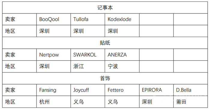 亚马逊记事本、贴纸、首饰类别下销量 Top10 商家里面的中国卖家丨数据来源:亚马逊