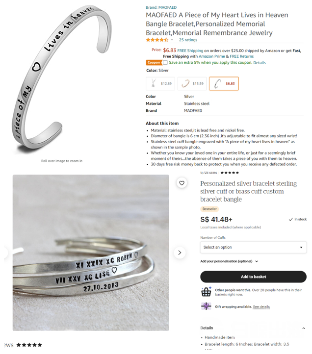 亚马逊(上)和Etsy(下)上类似款式手镯的定价
