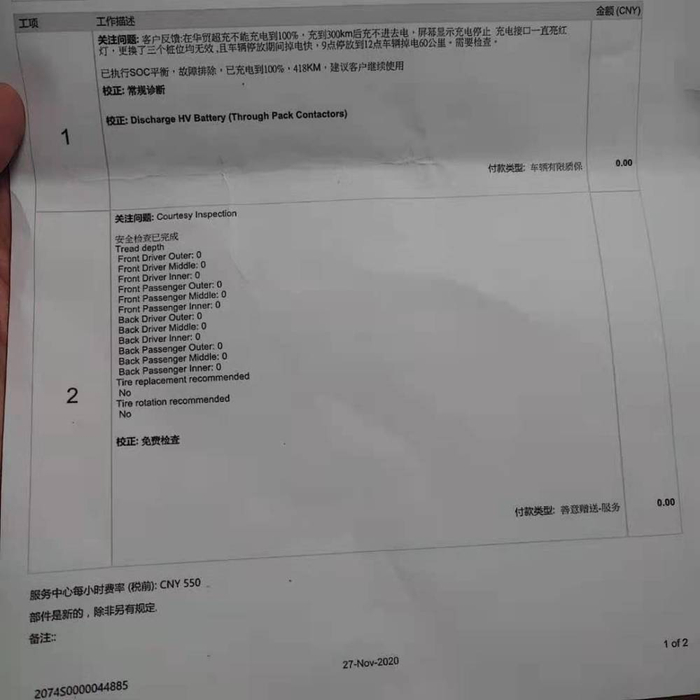 王先生到特斯拉维修中心进行平衡校准的维修单据