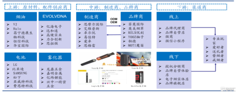 图1:电子烟产业链,来源:前瞻研究员、创亚咨询、华创证券代工厂的上游对接着原料供应商,包括烟油、雾化器、配套电子元件组等,实现了电子烟原材料的产业细分,代工厂以ODM/OEM模式为下游品牌商们提供一体化品牌设计和产品供应服务。