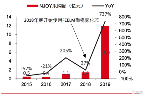 采用FEELM技术的电子烟产品能够显著提升市场销量,以2018年世界第五大电子烟公司NJOY为例,在导入FEELM陶瓷雾化芯之后,该年NJOY的采购额较2017年提升了7倍多。