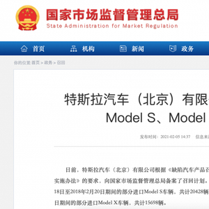 在美国和德国监管机构的调查下,特斯拉宣布对旗下车型进行召回。2月2日,特斯拉公司宣布,由于触摸显示屏存在导致某些安全功能缺失的问题,将召回约13.5万辆Model S/X。2月5日,特斯拉(中国)也宣布召回部分进口Model S、Model X电动汽车,共计约3.6万辆。