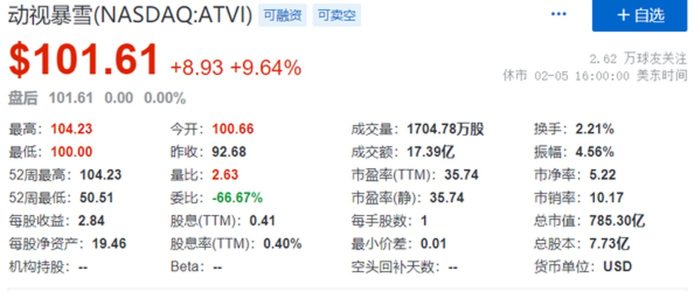 美东时间2月4日消息,动视暴雪公布了 2020 财年第四季度及全年财报。整个2020财年,动视暴雪的净营收为80.86亿美元,相比之下2019财年为64.89亿美元,不及预期。截至目前,动视暴雪股价为101.61美元,上涨9.64%%,总市值为785.3亿美元。