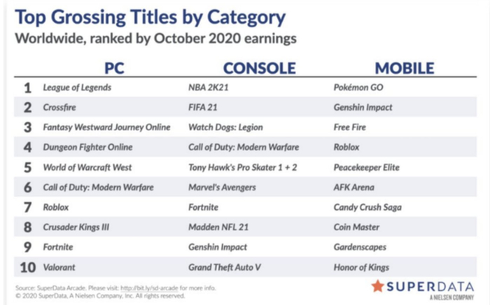 2020年10月美国市场研究公司superdata统计了全世界PC端游戏2020年10月份的收入情况,其中《英雄联盟》位于榜首,直到第五才是动视暴雪公司的《魔兽世界》。而前三分别是拳头公司、Smile Gate、网易。