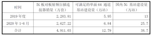 按照一个5G宏基站要384套射频微波连接器计算,据公司招股,2019年公司销售2284万套射频微波连接器,对应可满足64通道基站5.95万座,当年国内建设13万座5G宏基站,这么测算,当年公司提供的射频微波连接器满足了市场接近一半的5G宏基站需求。在2020年1-6月,公司的销量也满足市场5G宏基站射频微波连接器约四分之一的需求,比例非常高。