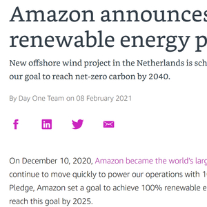 财联社(上海,编辑 史正丞)讯,当地时间周一,亚马逊发表官方声明宣布提前订购荷兰风电农场的过半产能,进一步巩固采购可再生能源最多企业的地位。