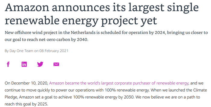 亚马逊在声明中确认,公司将采购该农场380兆瓦的发电量以支持欧洲地区的运营,这也是亚马逊迄今为止参与规模最大的可再生能源项目。预计荷兰风电农场在2024年投入运营,有助于将公司实现100%使用可再生能源的目标从2030年提前至2025年,同样也使得公司距离2040年净碳排放归零的目标更进一步。
