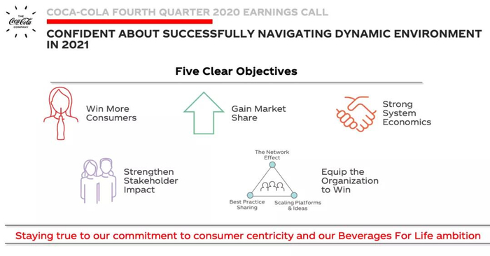 “2020年,可口可乐公司和瓶装合作伙伴的全体员工全力以赴,不断学习和适应这场全球危机,共同砥砺前行。我们在2020年取得了可喜的进展,例如为加速公司转型而采取了一系列举措,让我们有信心能在未来一年恢复增长。”可口可乐公司董事长兼首席执行官詹鲲杰(James Quincey)今天表示。