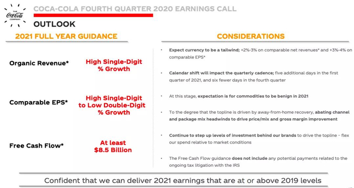 展望2021年,可口可乐公司预计,有机收入将实现高个位数的增长,可比每股收益将实现高个位数到低个位数的增长。