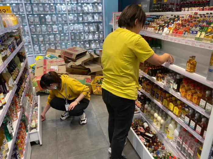 据观潮新消费的探店体验,近千平的店内只有4个身着黄色衣服的机动店员,高峰时期增加到7个。店员的主要工作是巡店和理货,大部分时间都是顾客自取购物筐挑选商品,很少出现需要询问店员的情况。