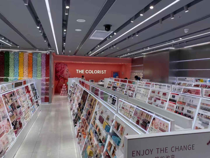 如小麦所说,调色师店里最被各路博主称道的就是店内色彩夺目的“美妆蛋墙”,同样的,KKV门店中也设有大量的“产品墙”。